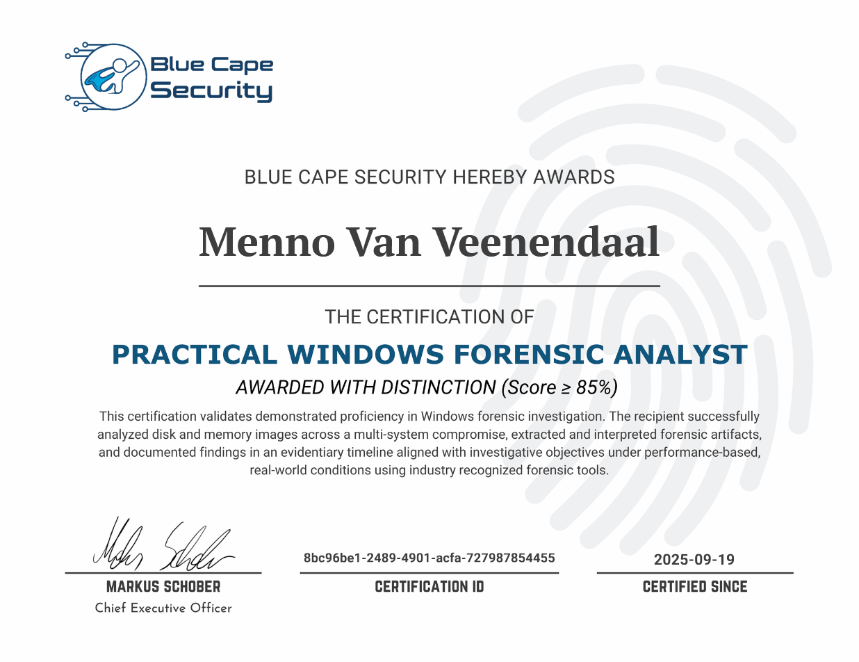 To prepare for the PWFA, Blue Cape offers the Practical Windows Forensics course. This self-paced training consists of 18 explanatory modules and 52 practical labs. Together they provide both theoretical knowledge and hands-on practice for investigating and analyzing Windows-based attacks and intrusions.