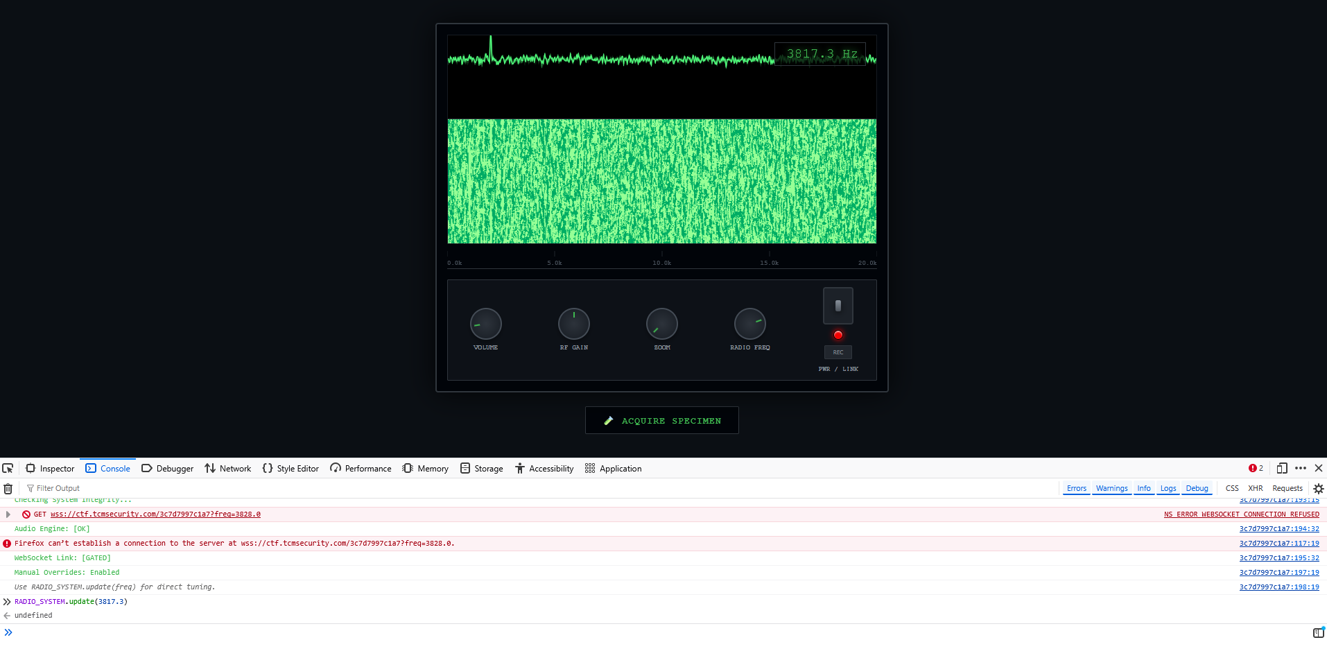 The Radio Freq button did not allow acquired input to this frequency, so I wanted to changed the HTML to this. In the browser console I found the function Use RADIO_SYSTEM.update(freq) for direct tuning. and used it to set the frequency to 3817.3. After enabling the radio, the static now included a repeating sequence of tones.
