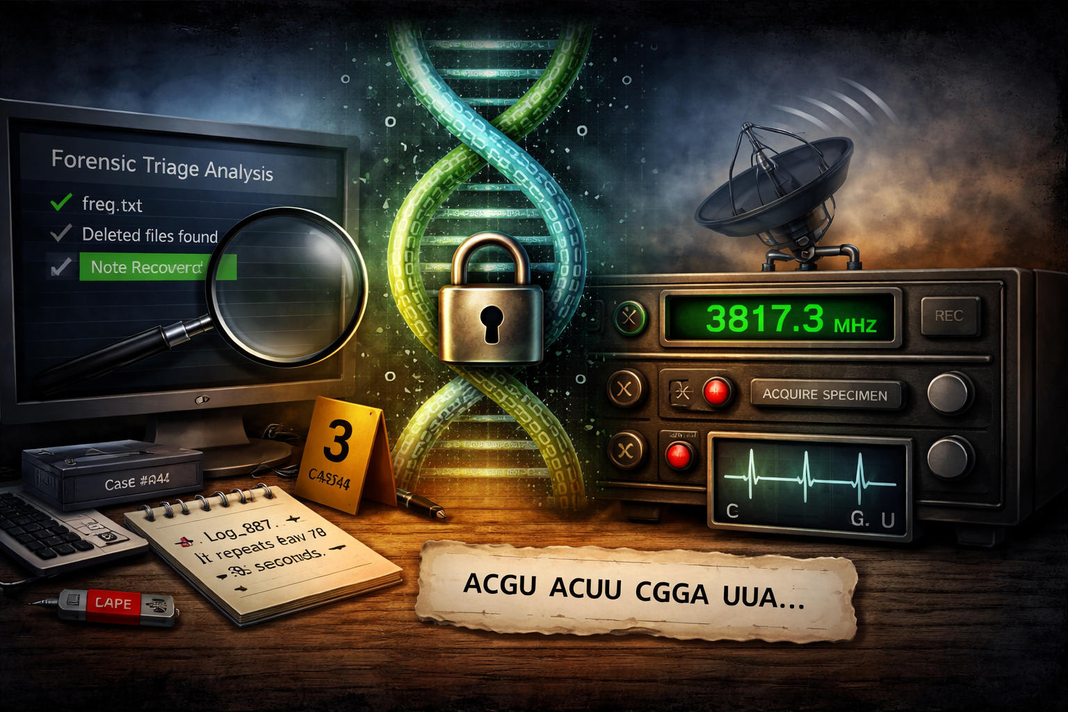 You have been provided a forensic triage image of Owens’ workstation. Your objective is to recover the deleted notes and identify the RNA-based key required to unlock his encrypted specimen archive.