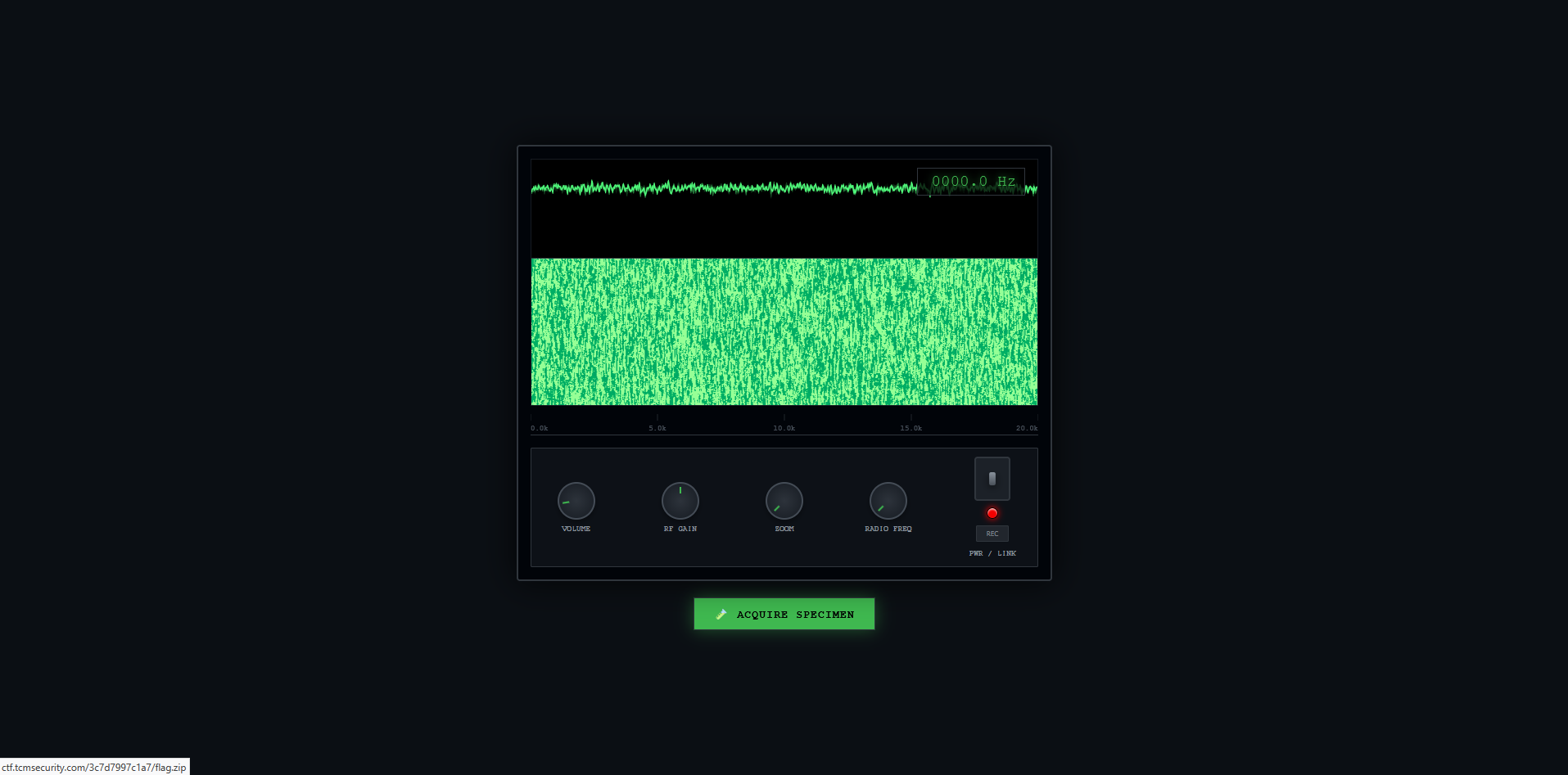 Clicking the “Acquire Specimen” button downloaded a file named flag.zip, which was password protected. The password was not ACGU.