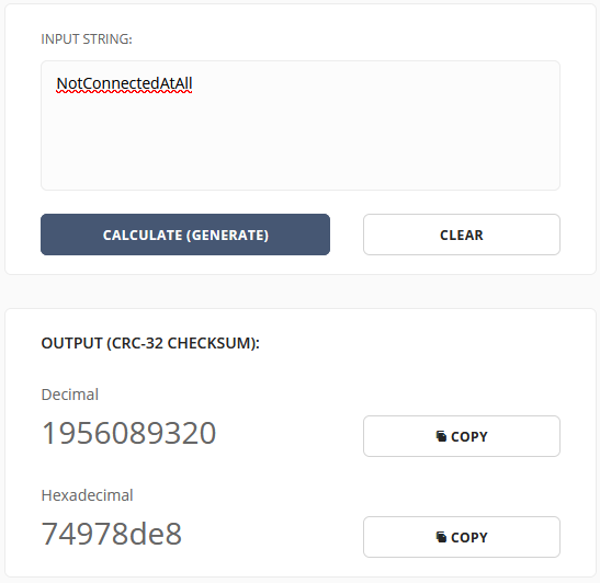 Any other inputs gave a different checksum. The CRC32 value matched the one found in the logging.