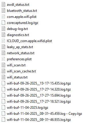 I could not confirm whether the iPhone 12 on iOS 26.0.1 also produced wifi-buf log files. With my current setup I cannot extract the full filesystem and therefore cannot access /var/mobile/Library/Logs/CrashReporter/WiFi/.